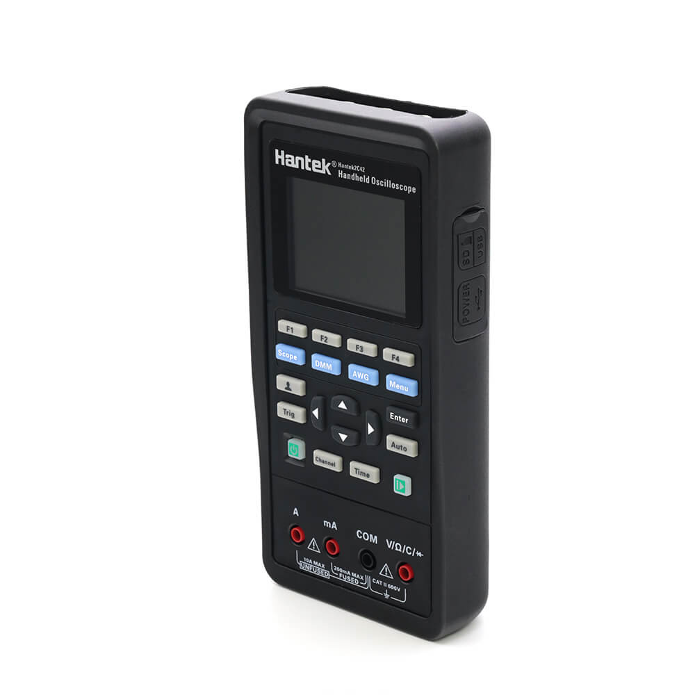 Осциллограф портативный Hantek 2C42 2-в-1 (2 канала, 40 МГц, осциллограф+мультиметр) является генератором сигналов произвольной формы. Литий ионные встроенный аккумулятор обеспечивает работоспособность устройства в нужный момент времени и на протяжении 24 часов непрерывной работы. Для зарядки может использоваться комплектный кабель, прилагаемый к устройству или стандартный USB-шнур с разъемом типа С. Используя удобную подставку при эксплуатации, можно расположить прибор в вертикальном положении. Управление осуществляется кнопками, а дисплей предназначен для измерения тока, напряжения, сопротивления. Дополнительные настройки расширяют функционал устройства.