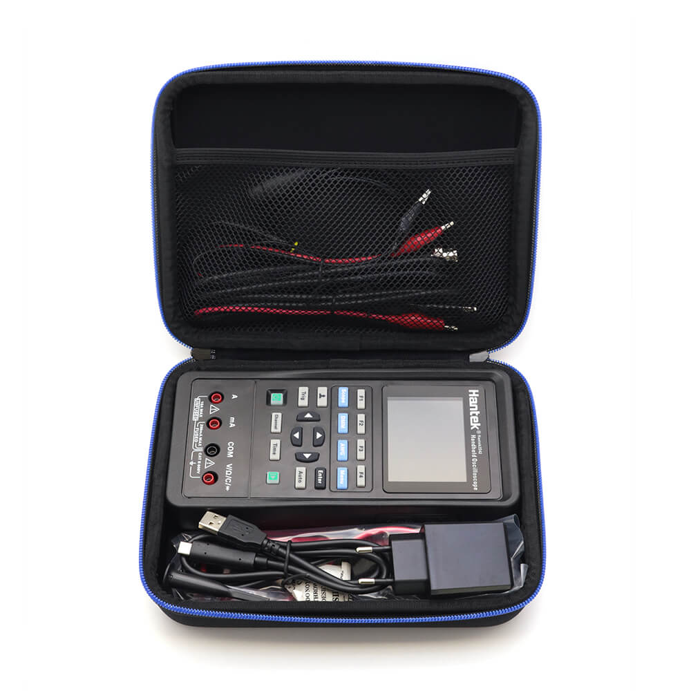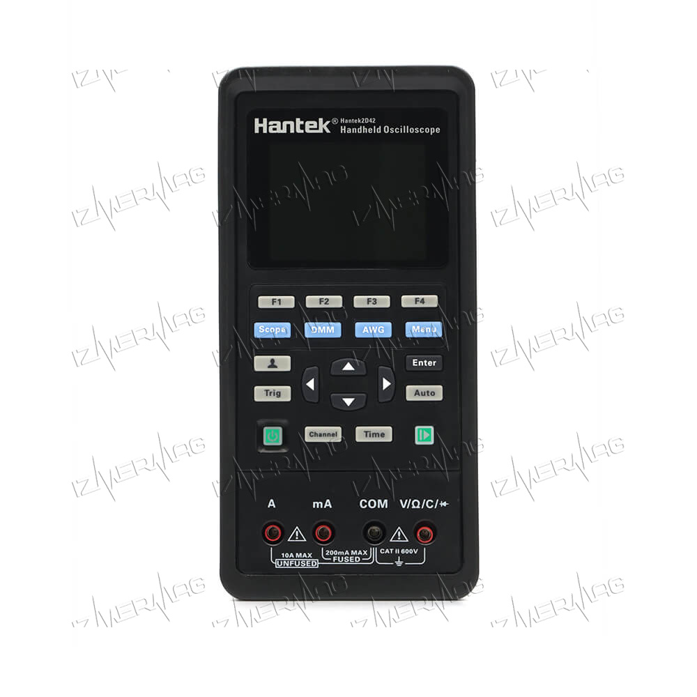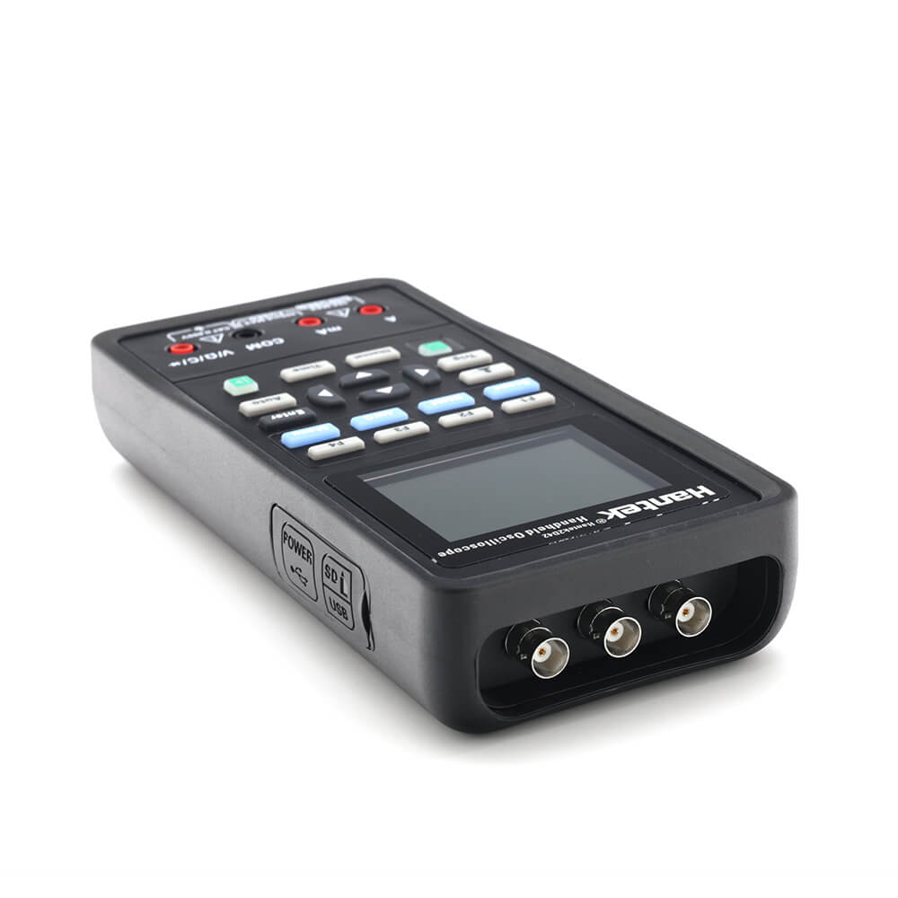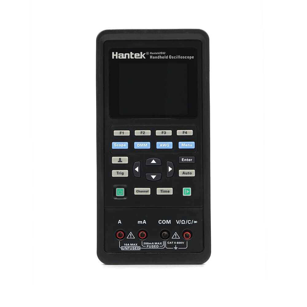 Осциллограф портативный Hantek 2D42 3-в-1 (2 канала, 40 МГц, осциллограф, мультиметр и генератор сигналов) представляет собой крупное и увесистое устройство, корпус которого покрыт прочной резиной. Наличие специального бортика вокруг дисплея и защитная пленка гарантируют надежную защиту в случае падения. Подпорка на задней крышке корпуса позволяет эксплуатировать устройство в вертикальном положении. Возможность подключения прибора к компьютеру позволяет зарядить устройство и организовать его перепрошивку в случае необходимости. Встроенный генератор позволяет задавать амплитуду сигнала до 2.5 В в частотной полосе 6-20 МГц.