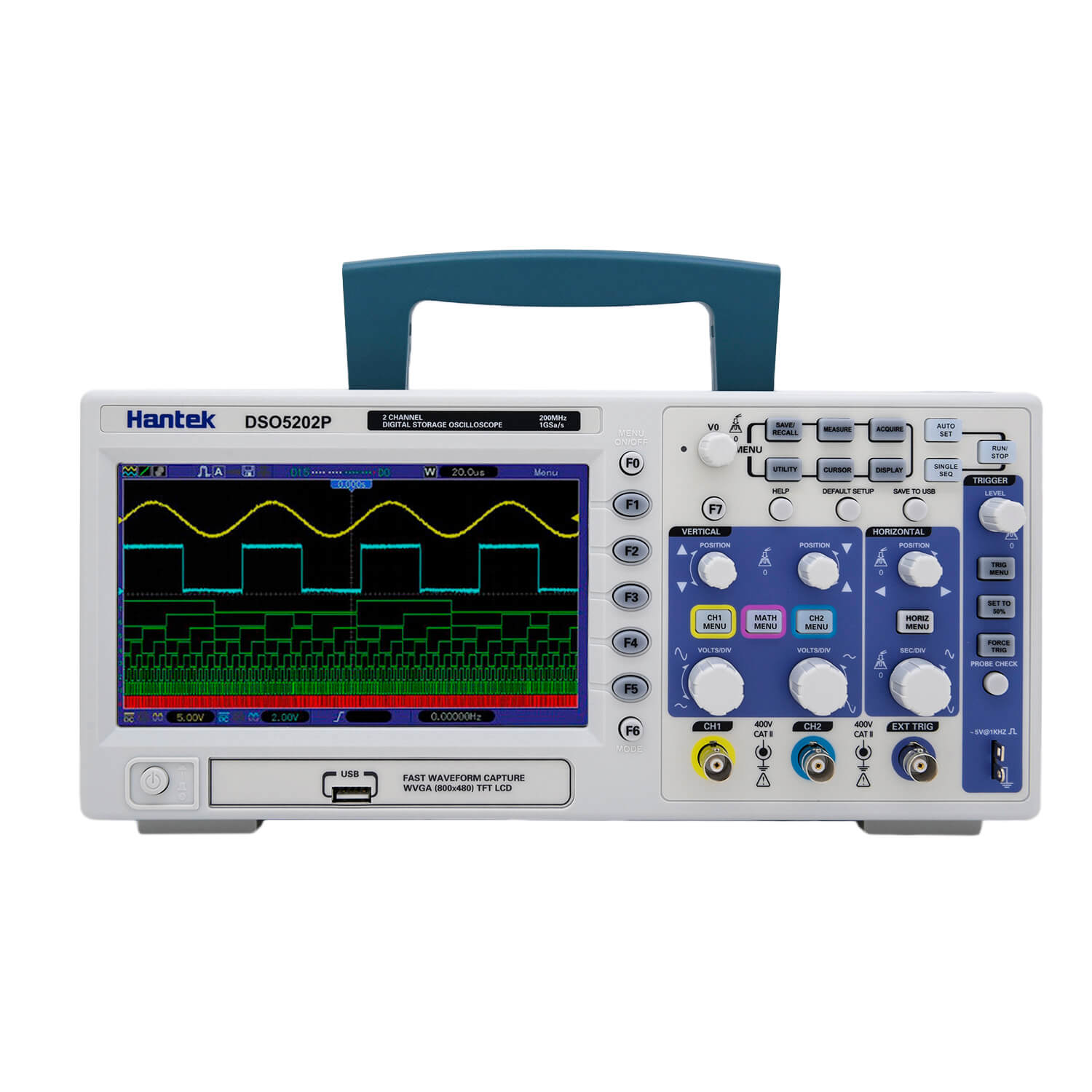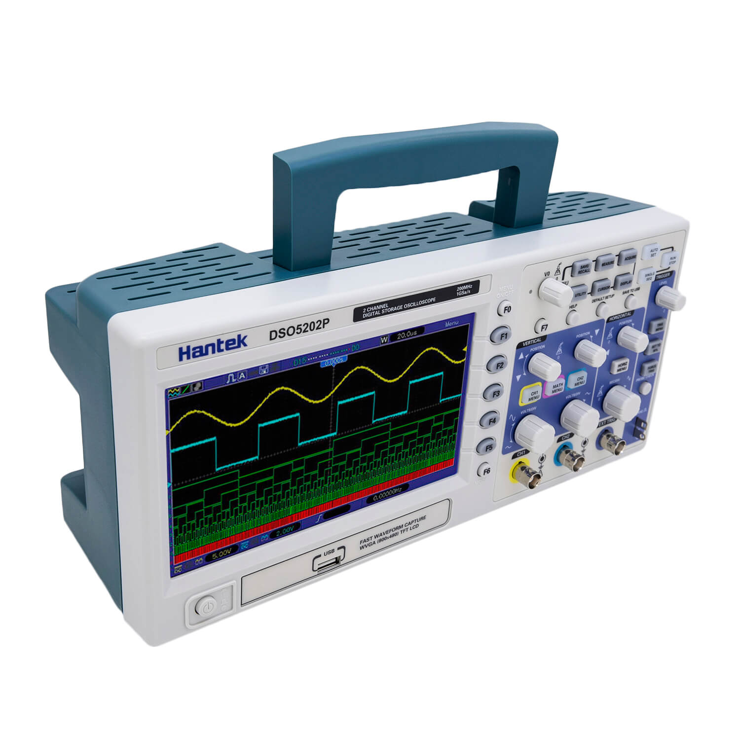 Hantek DSO 5202р - двухканальный портативный мультиметр. Применяется для выявления временных параметров сигнального напряжения и искажения, которое создает заданный участок цепи, определения вида шума и его колебаний. Прибор оснащен множеством дополнительных функций, дающих возможность ускорить работу оператора в электронике и диагностировании автомобильных систем. Предусмотрена поддержка USB-носителей и возможность подключения компьютера для сохранения исследований в онлайн-режиме. Устройство имеет цветной монитор, экран можно разделить на два окна в режиме масштабирования.